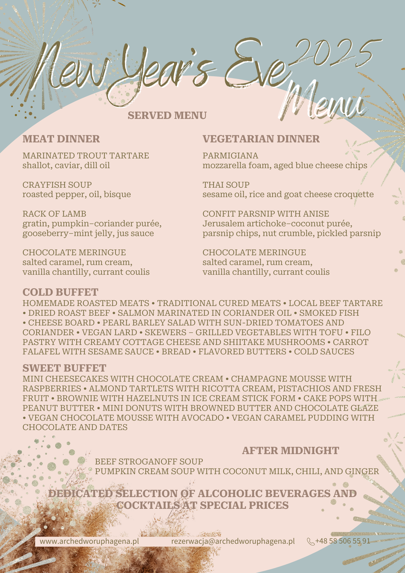 - exquisite menu: four-course served dinner, cold buffet, sweet buffet, welcome drink, glass of sparkling wine for the New Year's toast, non-alcoholic beverages (coffee, tea, water, fruit drinks);