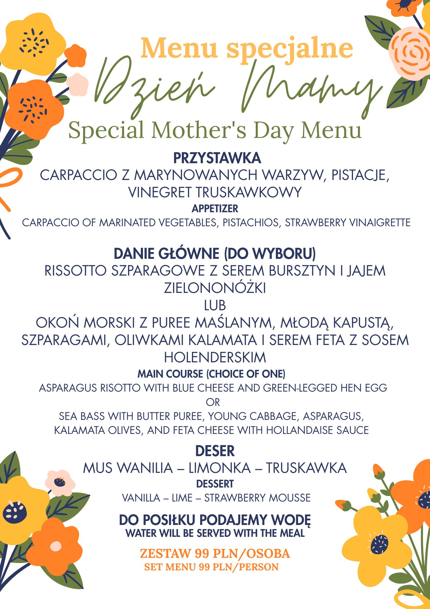 Z tej okazji zapraszamy wszystkie Mamy wraz z Bliskimi do Restauracji Stara Kuchnia na uroczystą 3-daniową kolację przygotowaną specjalnie na ten wieczór.