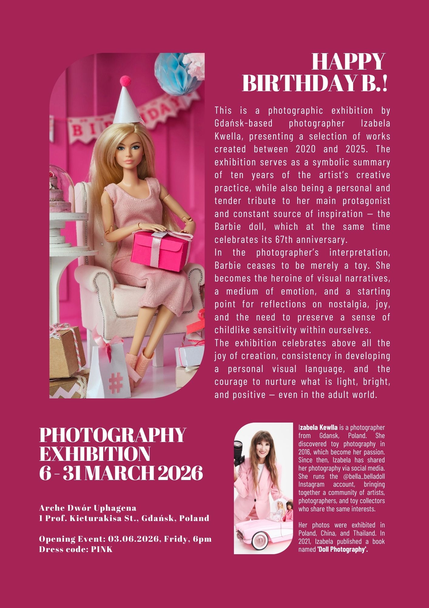 To wystawa fotograficzna gdańskiej fotografki Izabeli Kwelli, prezentująca wybór prac powstałych w latach 2020–2025. Wystawa stanowi symboliczne podsumowanie dziesięciu lat twórczej drogi artystki, a jednocześnie jest osobistym i czułym hołdem dla jej głównej bohaterki oraz nieustannego źródła inspiracji – lalki Barbie, która w tym samym czasie obchodzi swoje 67. urodziny.
