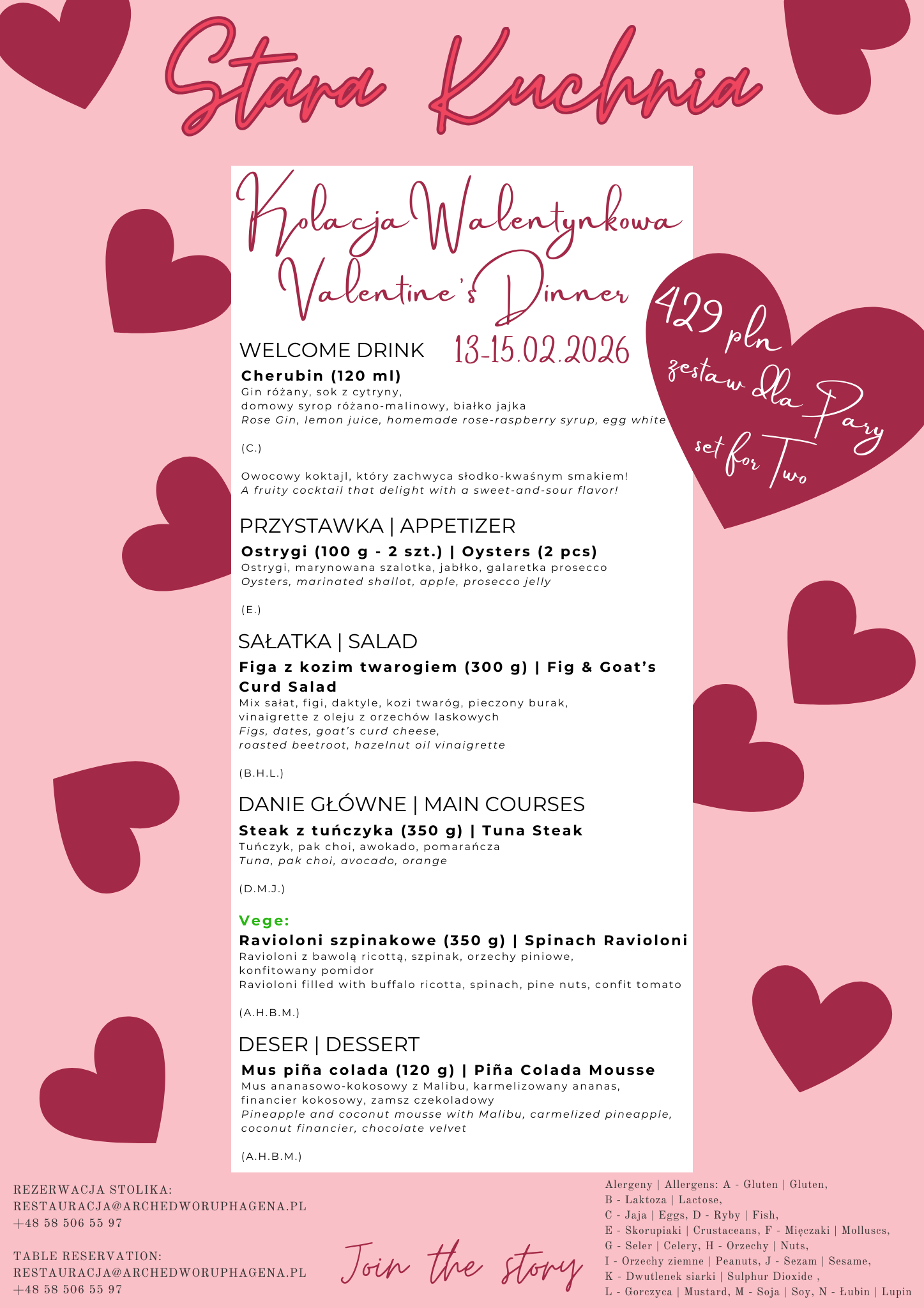 • Wykwintne, specjalnie skomponowane 4 daniowe menu walentynkowe z autorskim drinkiem na powitanie, które łączy tradycję z nowoczesnością (menu TUTAJ)
