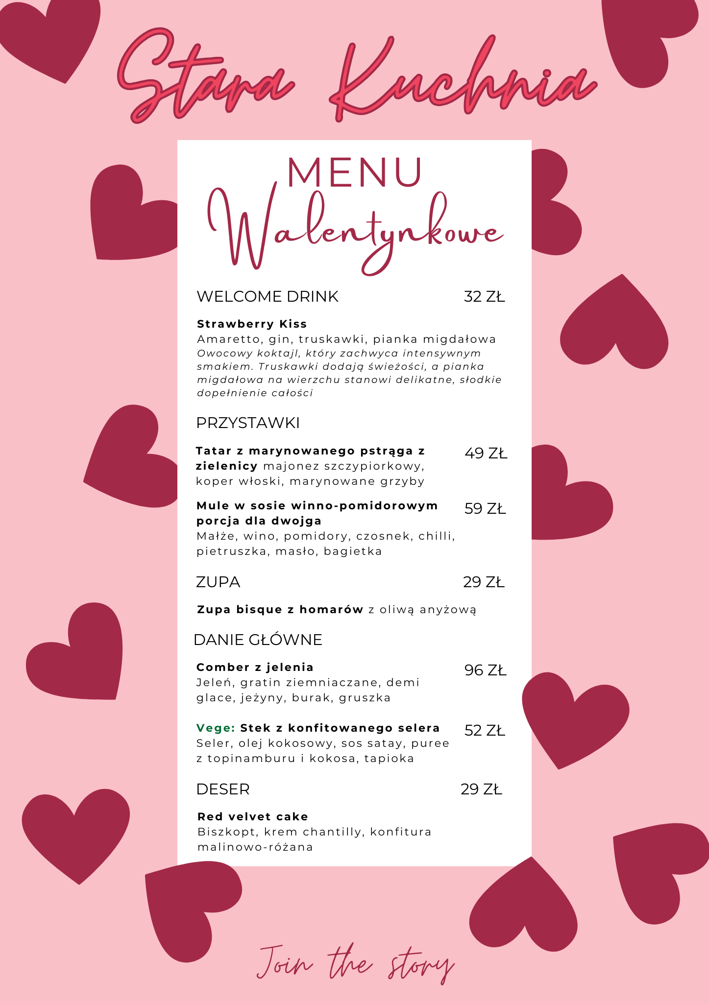 - Wykwintne, specjalnie skomponowane menu walentynkowe, które łączy tradycję z nowoczesnością